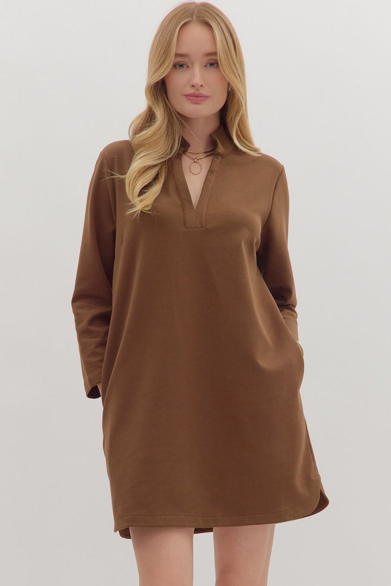 Brown Solid Long Sleeve Mini Dress featuring split V-neck with stand collar