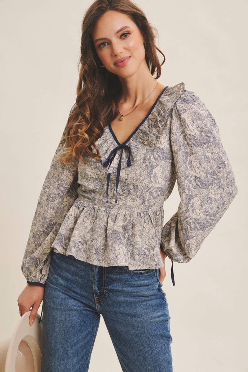 Blue Toile Printed Babydoll Blouse With Balloon Sleeves