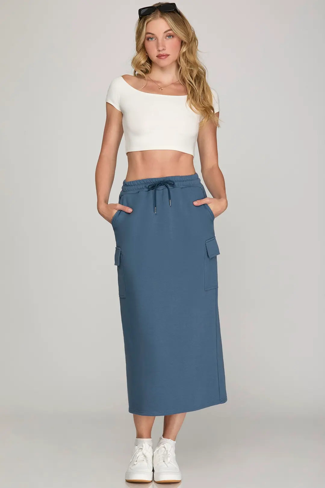 FRENCH TERRY KNIT CARGO MIDI SKIRT WITH ELASTIC WAISTBAND AND BACK SLIT