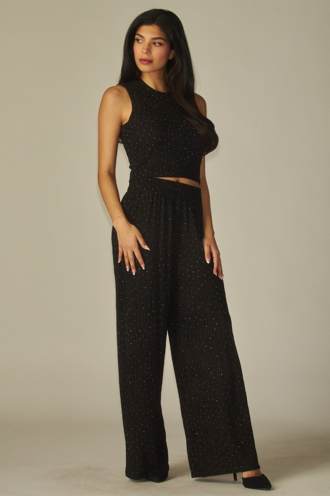 Black Crinkled Rhinestone Crop Top Loungewear Pant Set