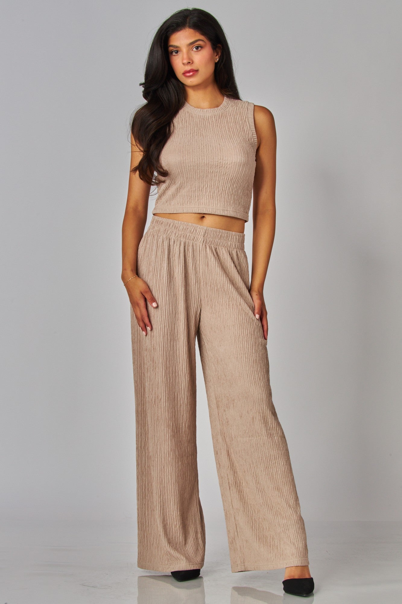 This crinkled textured sleeveless cropped top loungewear set in a gorgeous colors are the epitome of versatile chic. The unique crinkled texture adds a stylish dimension to the set, while the sleeveless cropped top offers a relaxed yet flattering fit. Perfect for lounging, this set can easily be dressed up with accessories and heels for a night out or dressed down with sneakers for a laid-back look